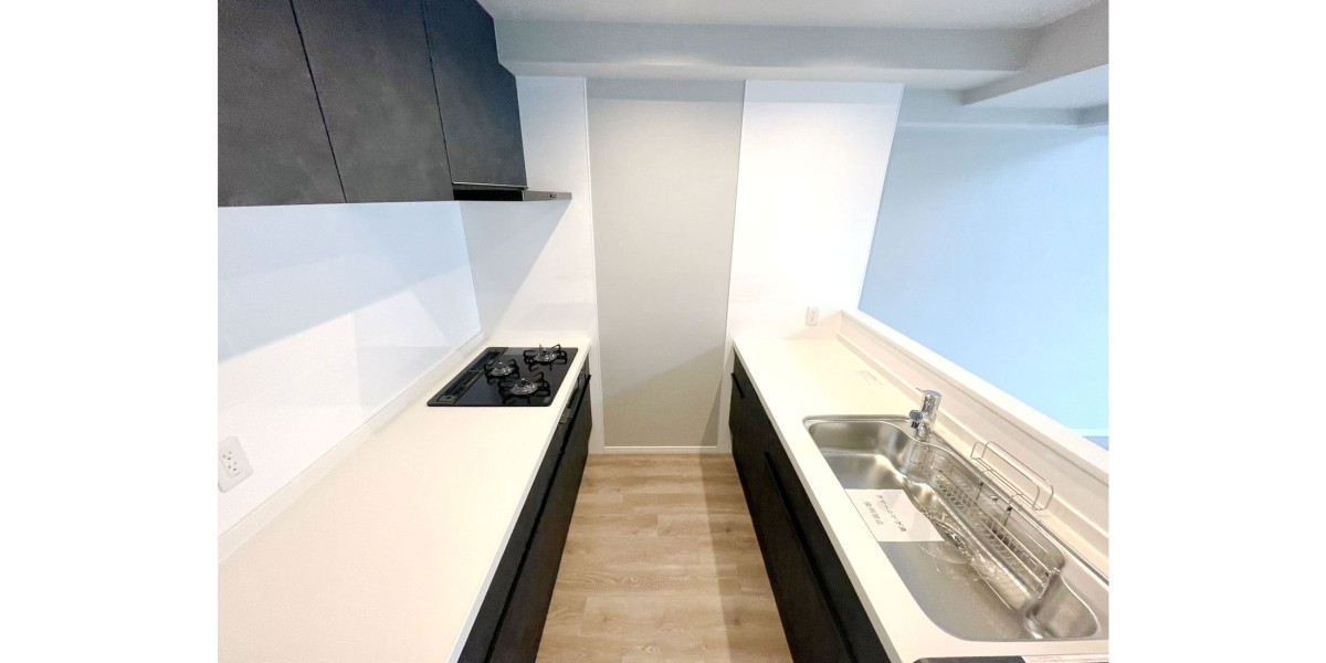 キッチンを2型で対面にすることで、コミュニケーションを取りやすく、明るい空間になるようにしました。また、キッチン入口とリビング入口が2つあり、キッチン入口すぐに冷蔵庫置場を設けたことで、荷物の出し入れがしやすく、動線が良くなるようにしました。