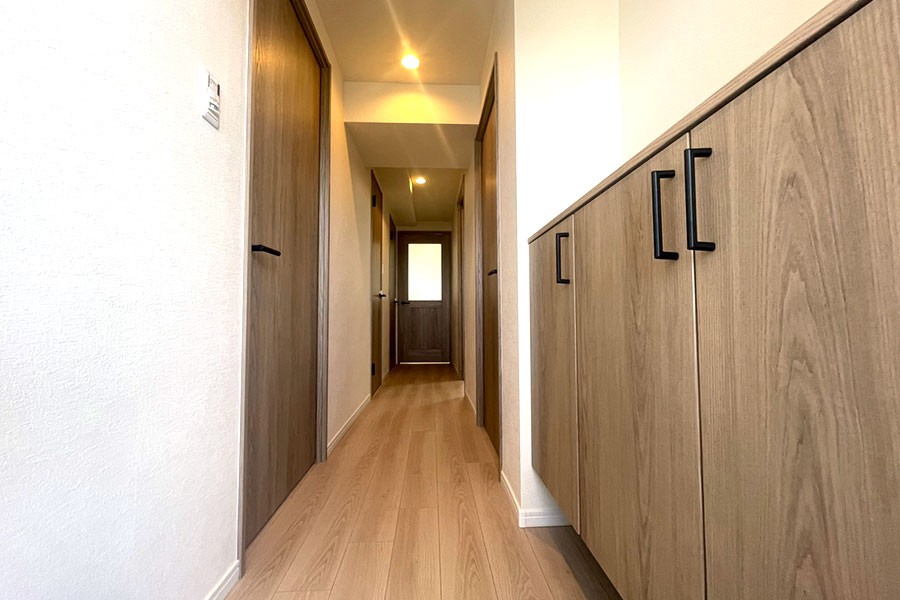部屋全体は白を基調とし、建具は木目調を選んでおり、シンプルですが、飽きがこない、落ち着いた空間になっております。また、設備関係はグレー調になっており、木目柄の建具と合う柄にになっています。インテリアの主役になる観葉植物を置いても映えます。