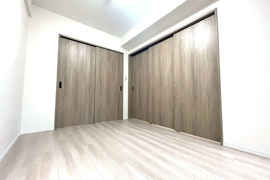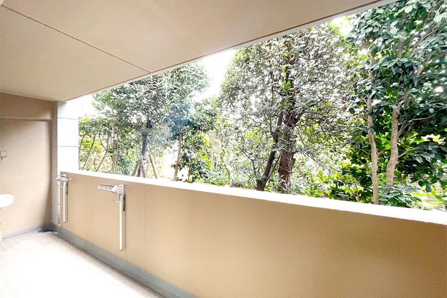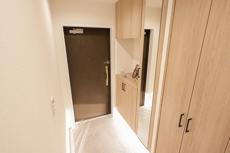 部屋全体は白を基調とし、建具は木目調を選んでおり、シンプルですが飽きの来ない落ち着いた空間になっております。また、設備関係はグレー調になっており、木目柄の建具と合う柄になっています。バルコニー側の植栽とも合っており、住み心地が良いです。