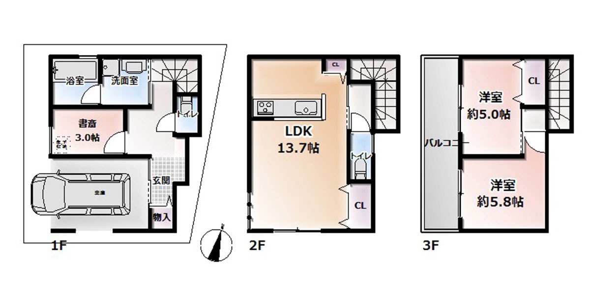 約13.5帖のLDKに、5.0帖と5.8帖の洋室が二部屋、洋室二部屋ともバルコニーに面した作りになっており、陽当たりよく、明るい空間になっております。また、書斎スペースを1階に配置し、静かな空間で仕事や趣味ができるよう、多種多様な使い方をしていただけます。