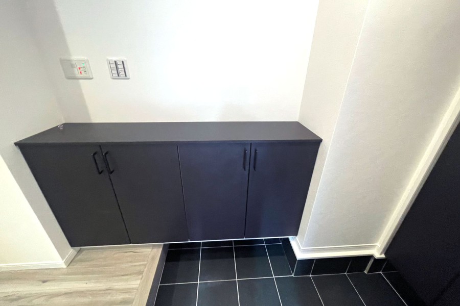 1階洗面室に乾太くを設置、バルコニーには隣地から見えないよう目隠しの壁を設置、玄関スペースにはシューズBOXとは別に、収納スペースを設置するなど細やかな配置にこだわり、住みやすい空間にしました。