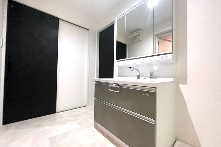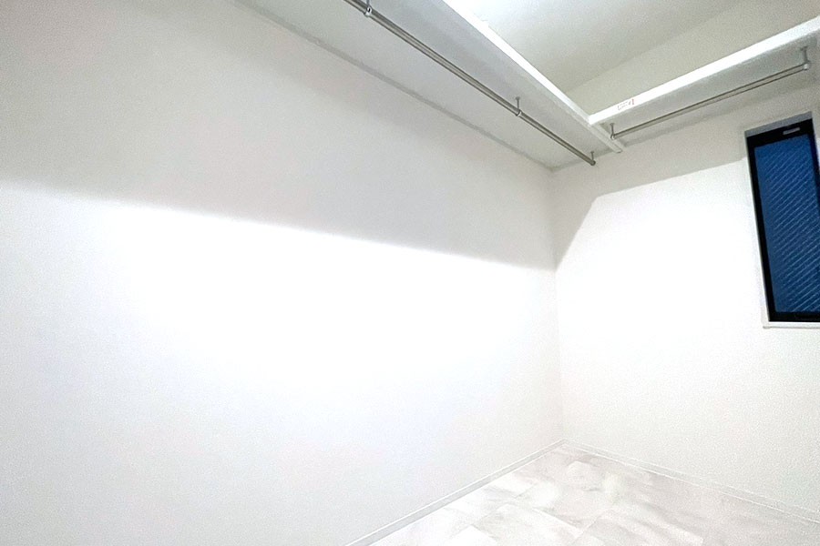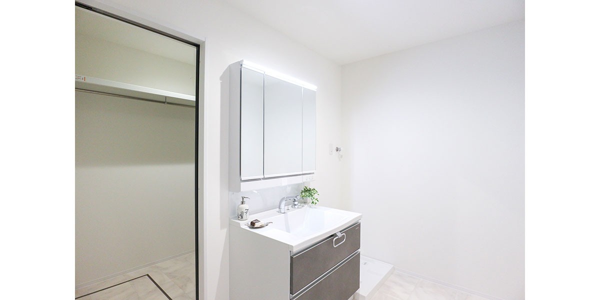 洗面脱衣所と隣接したWICを設け、つい多くなっていしまう水廻りの荷物もここで一つにまとめることができます。また、窓を付けているので湿気の心配がなく、WICの中もクッションフロアを採用しているため、床が濡れる心配がございません。