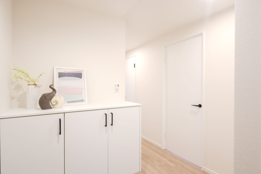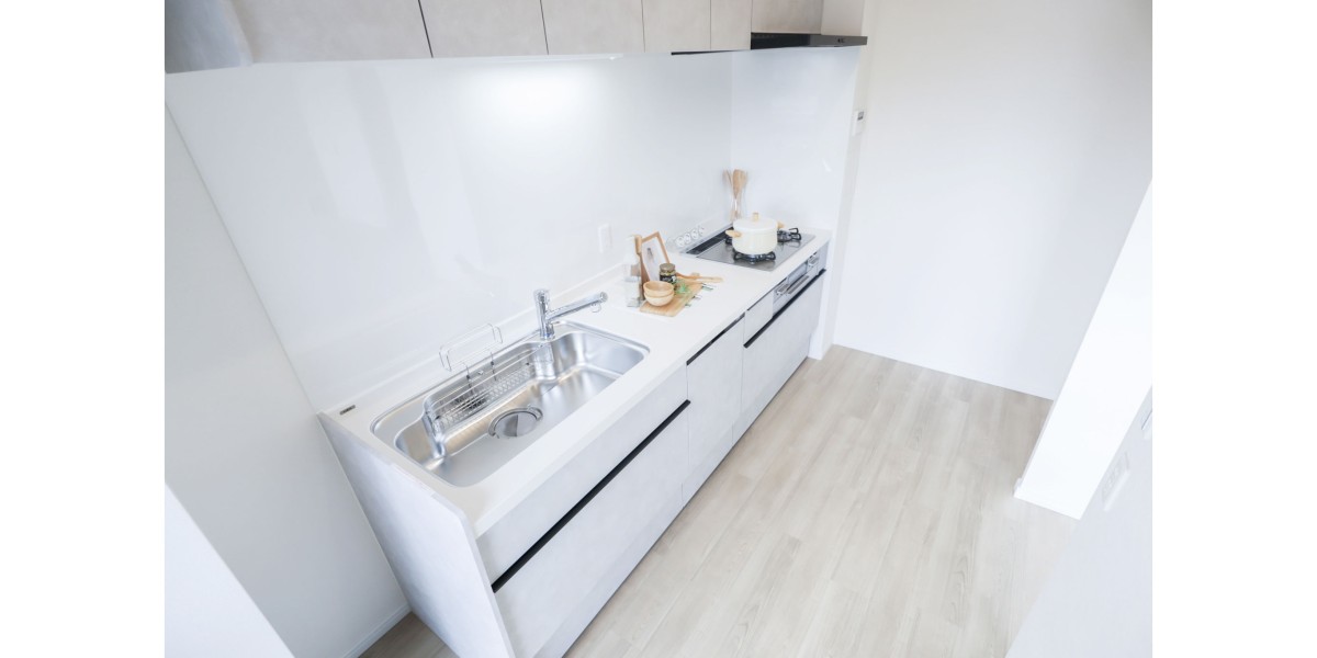 過度な装飾を抑え、全体をホワイトで統一し、明るく開放的な印象を演出しました。一方で把手などの細部にブラックを取り入れることで、空間を引き締め、アクセントを加えました。明るさの中に静けさが感じられるような余白のあるデザインを意識し、穏やかで心地よい暮らしを叶える空間に仕上げています。