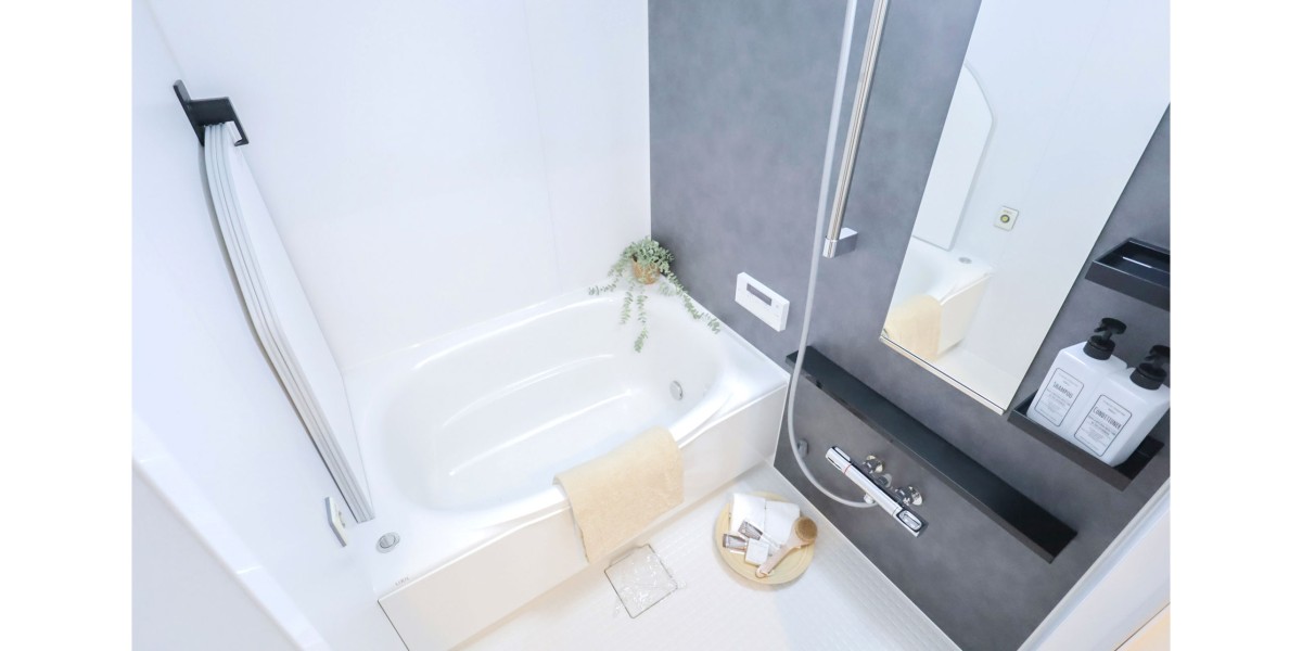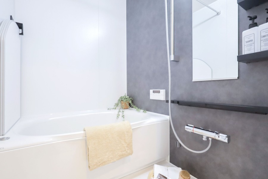ユニットバスにはモルティオダーク色のパネルを採用し、深みのあるトーンで上質感を演出しました。棚類をブラックで揃えることで全体の統一感を高め、ホテルライクな雰囲気の中に、日常のくつろぎを感じられるデザインとしています。