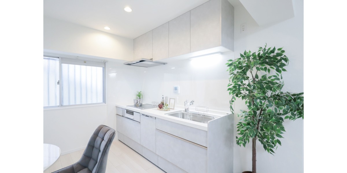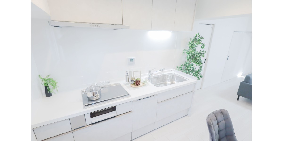 ホワイトベースのフローリング、建具、システムキッチンを採用することで、明るく広く感じられる空間をデザインしました。