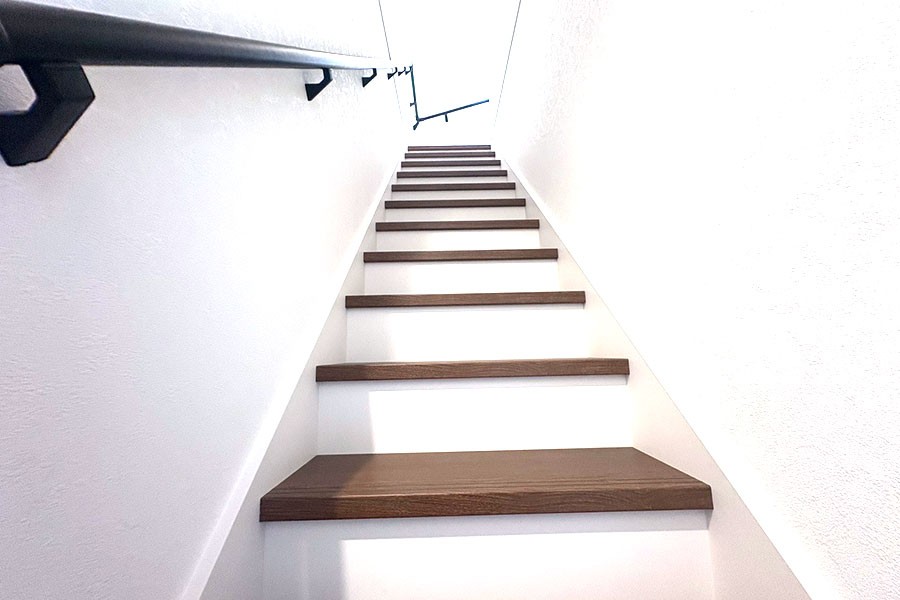 スケルトン階段を採用し、開放感とデザイン性を演出しました。ブラックと木目の組み合わせによって、空間全体をスタイリッシュに仕上げました。