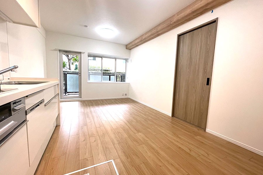 リビングはキッチン、クロスをはじめ白を基調とし、各部屋の建具、床材、下駄箱は木目調を選んでおり、また梁にも木目のアクセントクロスを採用することで、より和風と自然と生かして、落ち着いた空間をイメージしました。
