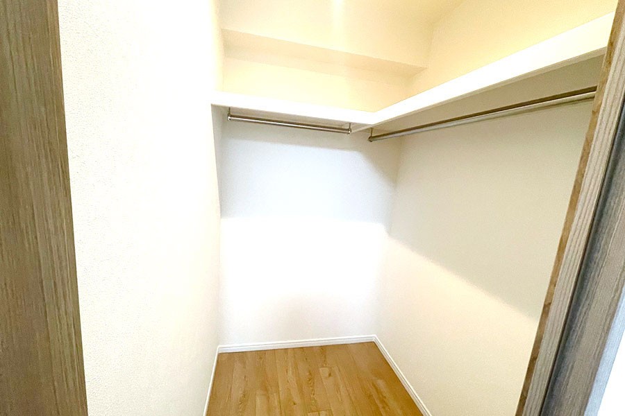 各洋室にはウォークインクローゼットを設置し、広い収納スペースを確保しました。ウォークインクローゼット内にはハンガーパイプと棚が設置されているので、帽子・バッグ・アクセサリーなどの小物を収納することも可能で、尚且つスーツケース、ゴルフバックなど大きなアイテムも簡単に収納できます。