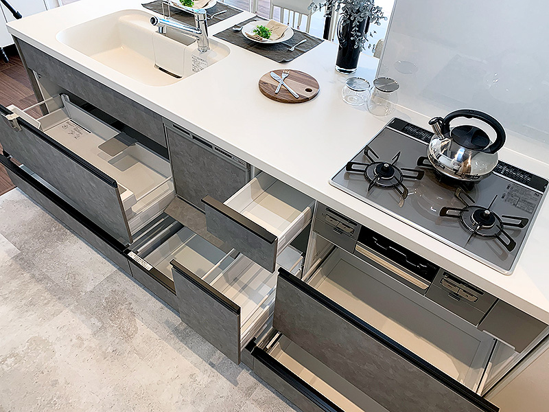 キッチンも壁をなくしてオープンにして収納スペースも設けました。